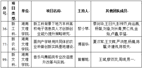 近日,湖南省教育厅发布《关于2025年湖南省新工科、新医科、新农科、新文科研究与实践项目立项的通知》,学校黎小琴、傅丽华、曾娜妮三位老师申报的项目分别成功获批新工科、新农科、新文科研究与实践项目,充分彰显了学校在高水平应用型人才培养和学科创新领域的实力与担当。